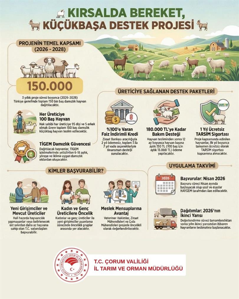 Kırsalda Bereket Küçükbaşa Destek Projesi kapsamında, Bakanlığımız Hayvancılık Genel Müdürlüğü (HAYGEM) koordinasyonunda Tarım İşletmeleri Genel Müdürlüğü'ne (TİGEM) ait küçükbaş hayvanlar üreticilere verilecektir.